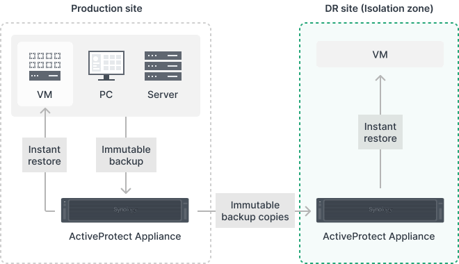 Perform disaster recovery drills periodically via a built-in virtual machine without any impact to your production site in order to recover data effectively.